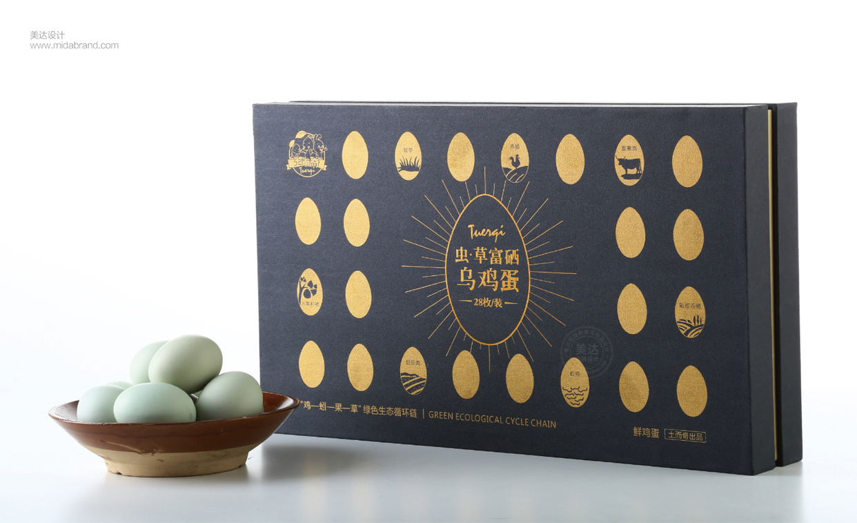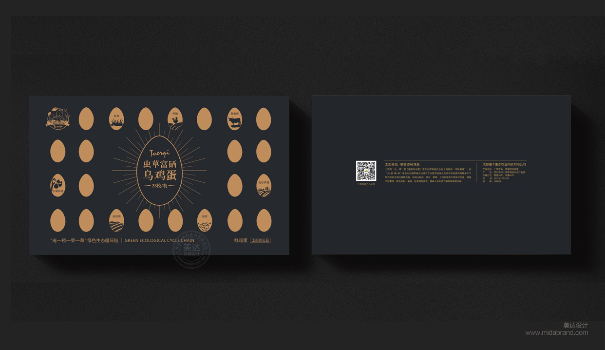 美達設計為土而奇農場設計的包裝禮盒設計深受市場好評,土而奇“蟲·草”蛋(富硒烏雞蛋)源于世界稀有的古老土雞品種“舊院黑雞”,在“雞-蚓-果-草”綠色生態循環鏈農業模式下全程低密度生態放養或高福利養殖條件下所產的純天然的富硒雞蛋,母雞以蚯蚓、昆蟲、青草、五谷雜糧等天然食材為食,雞蛋天然富硒,具有滋補、美容、延緩細胞衰老、提高人體免疫力等特殊保健功效。