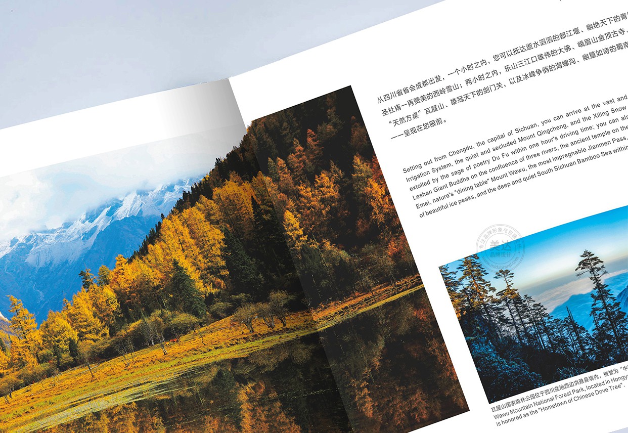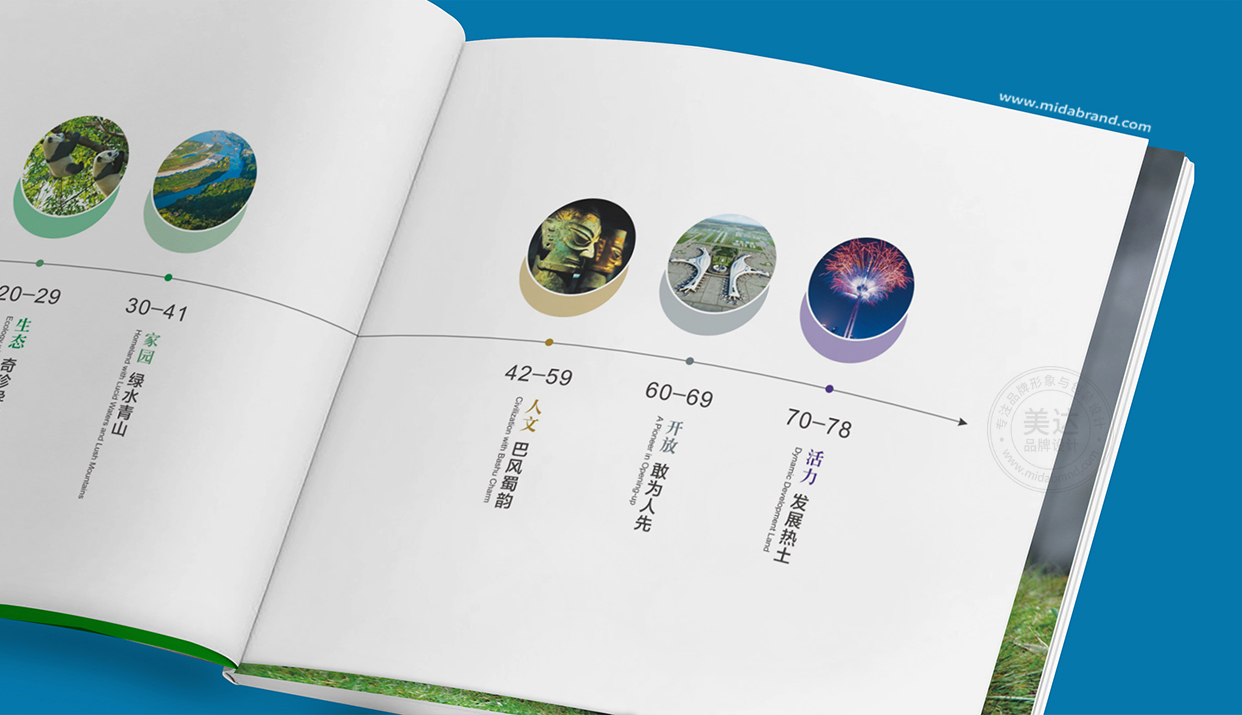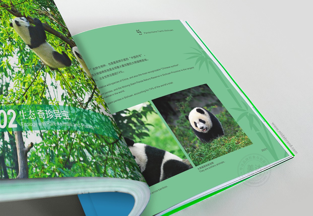 熊貓家園·天府四川作為一本對外宣傳交流的口袋書畫冊。本書分別從地貌、生態、家園、人文、開放、活力六個版塊進行圖文并茂的介紹美麗人文的四川。由四川省委宣傳部、四川省人民政府新聞辦公室主編,四川美術出版社出版,委托美達品牌設計負責整體的設計工作。