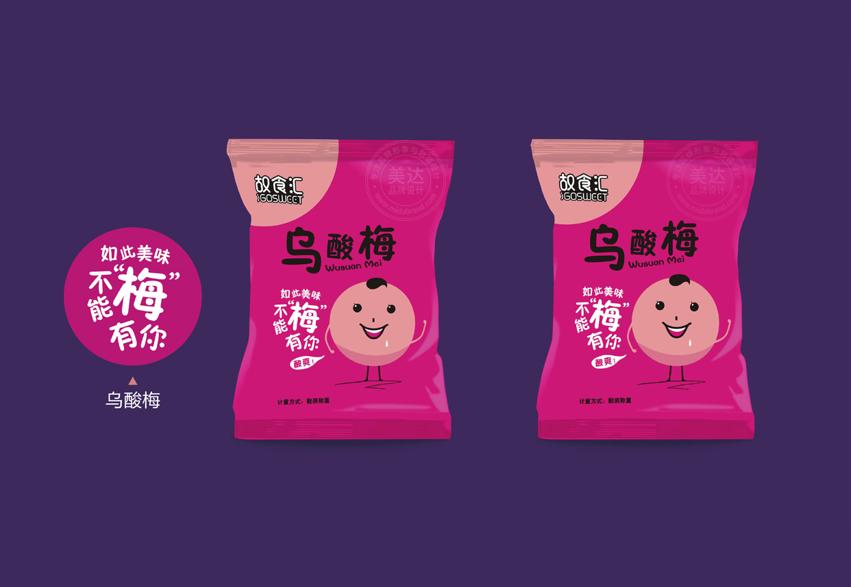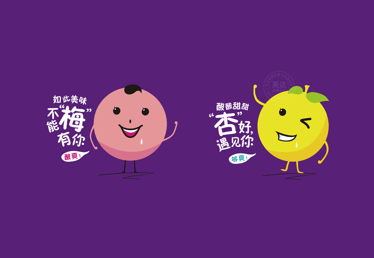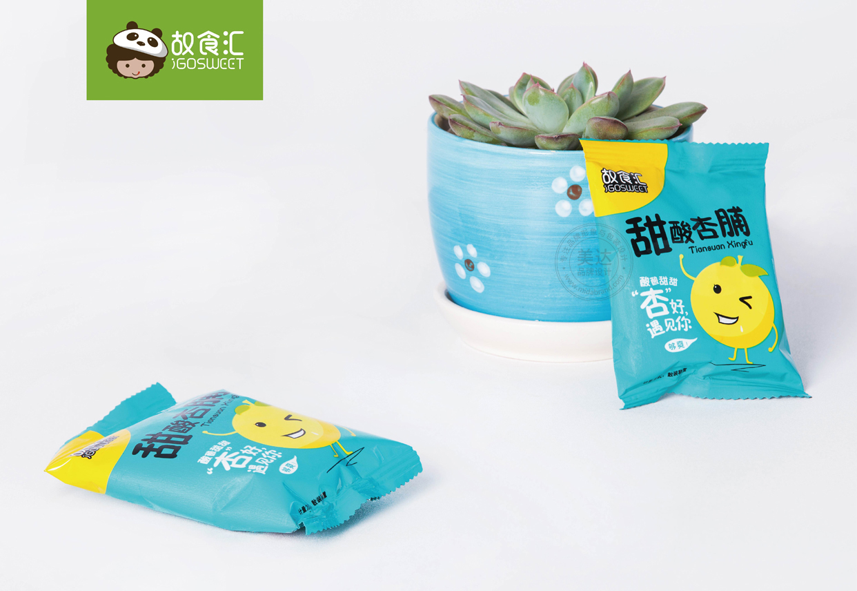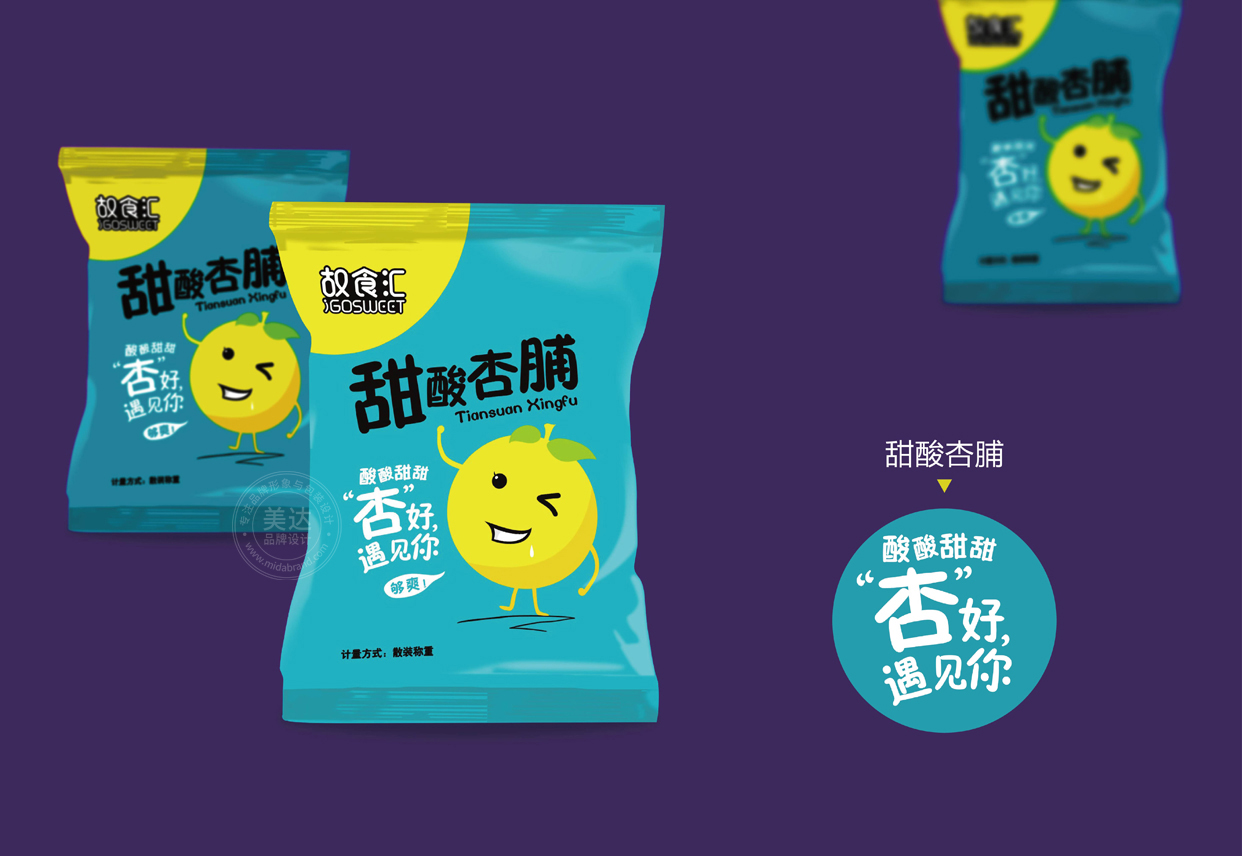 美達品牌將杏脯以擬人化的形象進行設計,微笑的嘴巴、逗趣的表情。同時我們根據產品本身的甜酸特點,創作了:酸酸甜甜“杏”好遇見你,夠爽!的趣味文案,拉近了產品與消費者的距離,賦予產品以性格。包裝的色彩運用了蒂芙尼藍與暖黃色,兩種冷暖色彩的強烈對比和碰撞,既展現了酸與甜的味覺感受,也使得包裝充滿時尚感。