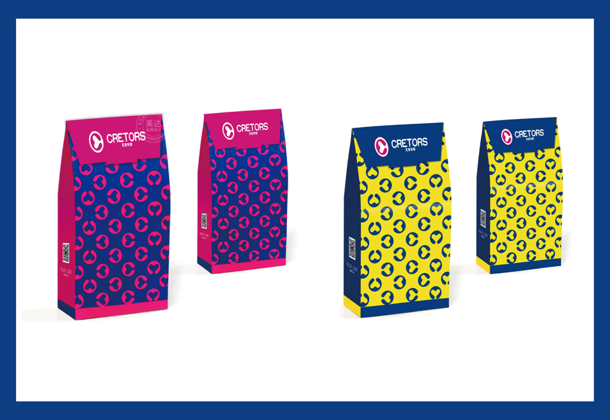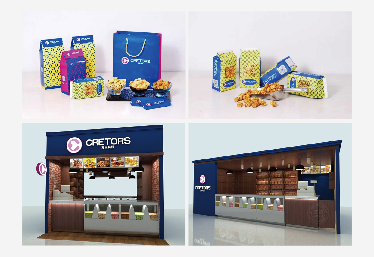 克里特斯作為一個原汁原味的美國爆米花休閑時尚品牌,標志以CRETORS的首字母“C”為創(chuàng)意點,字母C與心形結(jié)合,俯視看像一個人在擁抱心。由此我們提煉出了克里特斯的廣告語“擁抱愛的味道!”。將標志作為輔助圖形應用在包裝上,通過排列組合,增強包裝的時尚感。店面的設(shè)計融入了紅磚與深褐色的木材,通過藍色、玫紅色的搭配形成時尚的美國味。
